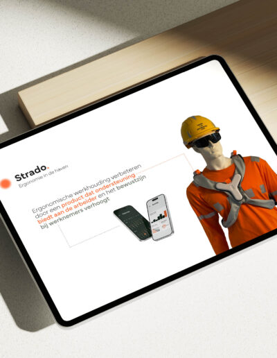 STRADO is een houdingsondersteunend harnas dat musculoskeletale klachten bij havenarbeiders helpt voorkomen. Het combineert actieve feedback met passieve monitoring via sensoren en een mobiele applicatie. De borstmodule corrigeert de houding subtiel, terwijl schoudersensoren data verzamelen over asymmetrie. STRADO overstijgt het signaleren van problemen en biedt een eerste stap richting actieve gedragsbeïnvloeding. De ambitie is om fysieke belasting bespreekbaar, zichtbaar en beheersbaar te maken, met het oog op duurzame inzetbaarheid.