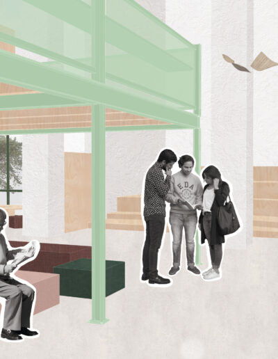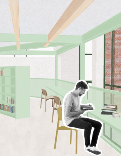 De neoromaanse Heilig-Sacramentskerk, ontworpen door architect René Van Steenbergen, werd tussen 1953 en 1964 opgetrokken in Berchem. Hoewel deze kerk in 2026 zal worden afgebroken, tracht ik door middel van dit project de kwaliteiten en opportuniteiten van deze plek aan te tonen. Hiervoor maak ik gebruik van enkele ontwerpstrategieën uit het boek ‘Herscheppen. Ontwerpend onderzoek voor het Projectbureau Herbestemming Kerken 2016-2021’ voor een verbreed gebruik van religieus erfgoed. Zo werd onder andere het gesloten karakter van de gevel, door grote openingen te voorzien, getransformeerd naar een open structuur, waardoor er zichten van en naar de buurt ontstaan. Het interieur is reversibel en werd ontworpen vanuit de ontwerpstrategie ‘afzonderen’, waarbij een deel van de ruimte wordt opgedeeld en een intiemere plek ontstaat. De monumentale architectuur van het middenschip wordt op een menselijke schaal gebracht door het implementeren van een groot boekenmeubel, bestaande uit twee niveaus. Het toevoegen van de verschillende vloerplaten creëert een nieuwe beleving van het kerkgebouw.
