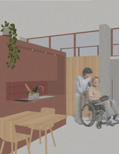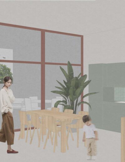 Het ontwerp behoudt de brutalistische elementen, zoals betonstructuren en bandramen, en voldoet aan moderne eisen voor comfort en duurzaamheid. Een zorgvuldig doordacht zoneringsplan creëert een harmonieuze woonomgeving, verdeeld in private, gedeelde, publieke en groene zones, die sociale interactie en levenskwaliteit bevorderen. Een modulair systeem met drie soorten woonunits op een raster van 1,3m x 1,3m zorgt voor flexibiliteit binnen de bestaande kolom- en raamstructuur. De units, ontworpen met multifunctionele blokken, worden omringd door ondersteunende functies die een functionele leefomgeving vormen. Het hergebruik van afbraakmaterialen draagt bij aan de duurzaamheid en behoudt de oorspronkelijke sfeer.