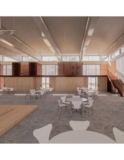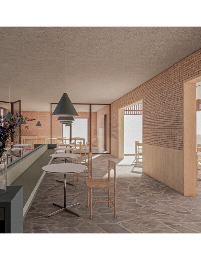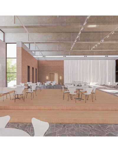 De architecturale benadering respecteert de bestaande toestand, met minimale ingrepen voor maximale polyvalentie. Belangrijke ingrepen zijn het openen van de gevel en het toevoegen van extra openingen om de connectie te versterken en de mentale toegankelijkheid te vergroten. Daarnaast is de circulatie geoptimaliseerd door een nieuw volume van glas toe te voegen, wat de multifunctionele gebruiksmogelijkheden en de verbinding met de omgeving verbetert.