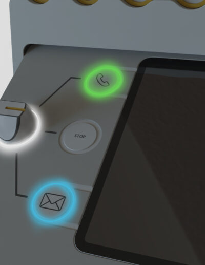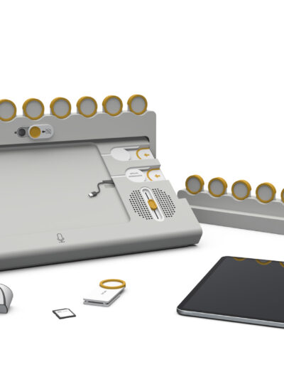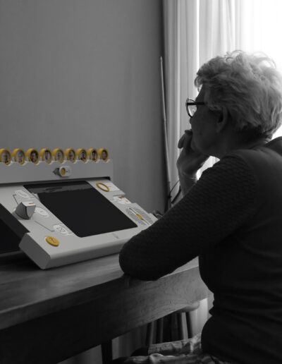 Dit product is speciaal ontworpen om digitale communicatie toegankelijk te maken voor ouderen die moeite hebben met technologie. Om dit te bereiken, is het aantal functies en stappen tot een minimum beperkt. De visuele informatie is overzichtelijk en spaarzaam, zowel op de interfaces als op het apparaat zelf. De bedieningselementen zijn groot en goed te onderscheiden. Deze knoppen hebben herkenbare vormen en kleurcodes om duidelijk aan te geven hoe ze gebruikt moeten worden. Het apparaat is voornamelijk lichtgrijs met witte zones rond de bedieningselementen, waardoor deze beter opvallen. Donkergeel wordt gebruikt om aan te geven hoe de bedieningselementen werken. Ook de microfoon en camera zijn visueel duidelijk gemarkeerd.