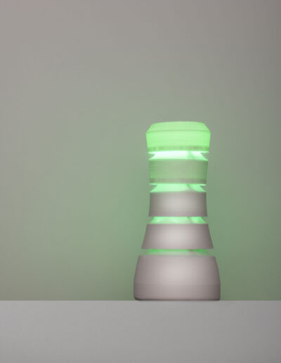 3. Bureaumodule: Deze module toont de gemeten lichaamshouding visueel in real time. Wanneer het kind krom zit, neemt de module ook een kromme houding aan. Drie verschillende kleuren benadrukken de houding, en de vormgeving verwijst naar de ruggengraat. Een intern mechanisme met een servo maakt de bewegingen mogelijk.